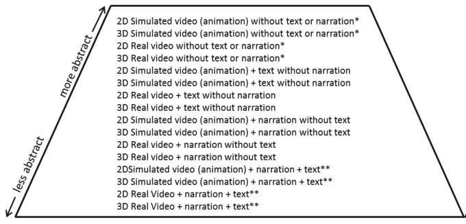 Le choix du degré d’abstraction dépend à la fois du sujet et de la connaissance préalable des apprenants. Par exemple, les étudiants sans antécédents dans un domaine auront probablement besoin d’activités multimédias moins abstraites au départ, et quand leur connaissance sur le sujet augmentera, ils pourront réaliser des activités plus abstraites. Ceci est cohérent avec la théorie de Piaget sur l’apprentissage de l’abstraction. Les matériaux doivent être adaptés au niveau de connaissance des apprenants, qui est appelé le principe de connaissance préalable (Kalyuga, 2005). Les auteurs précisent que le cône qu’ils proposent n’est pas destiné à classer les types de multimédia du meilleur au pire, car aucun niveau n’est le meilleur pour tous les apprenants, les matières et contextes. Il est destiné à donner une gamme de possibilités aux concepteurs pédagogiques.