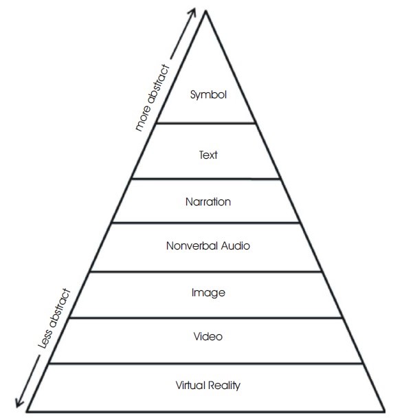 Edgar Dale précisait que lors de nos apprentissages les plus précoces, nous sommes tous passés par des expériences impliquant un certain degré d’abstraction, comme quand, enfant, nous devions parler d’une chose ou d’un être qui n’était pas présent dans la pièce avec nous. Le processus d’apprentissage de la lecture et de l’écriture est d’ailleurs un des apprentissages requérant un des plus hauts niveaux d’abstraction.